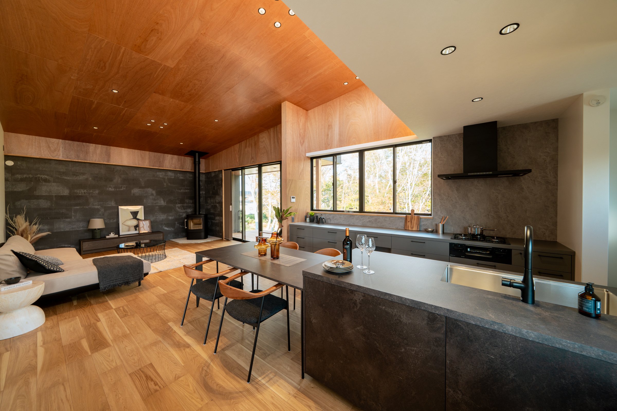 大谷石の薪ストーブ、スレート材のアクセント、ラーチ合板の勾配天井が重なり、落ち着きと深みある空気感を演出します。