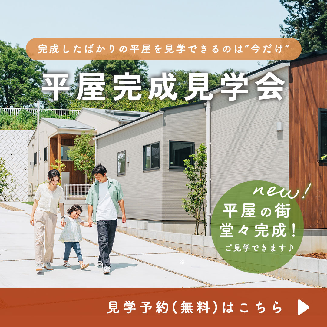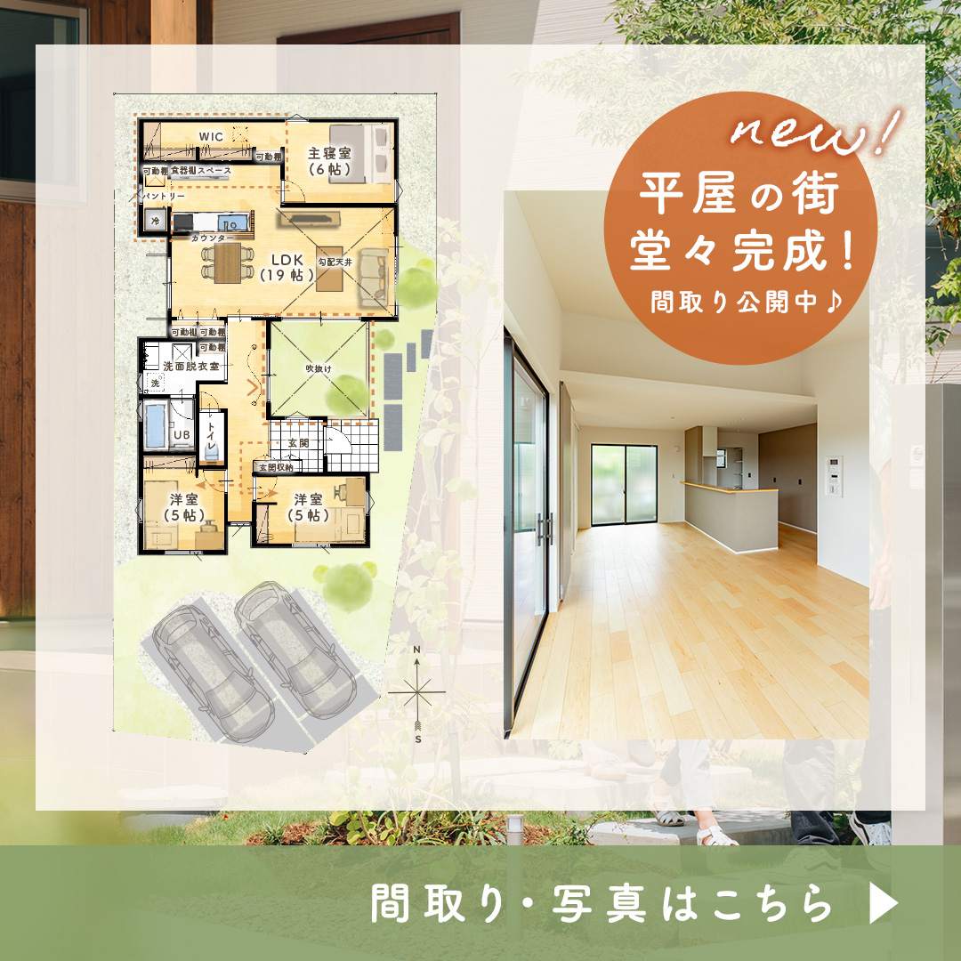 平屋の街がついに完成しました! 「平屋完成見学会」では、完成したばかりの平屋を実際にご見学いただけます♪ PLAN10:おうち時間を楽しむ♪子育て平屋 ・9月に完成したばかりのNEW平屋! ・水回り集中でスムーズな家事動線 ・充実の広々収納スペース♪ 千葉市中央区で利便性を手放さずに、ゆとりのある暮らしが叶うため、小さなお子様がいるファミリー層メインに選ばれています。 ぜひご家族揃って来場し、家族の暮らしに寄り添う平屋をご体感ください♪