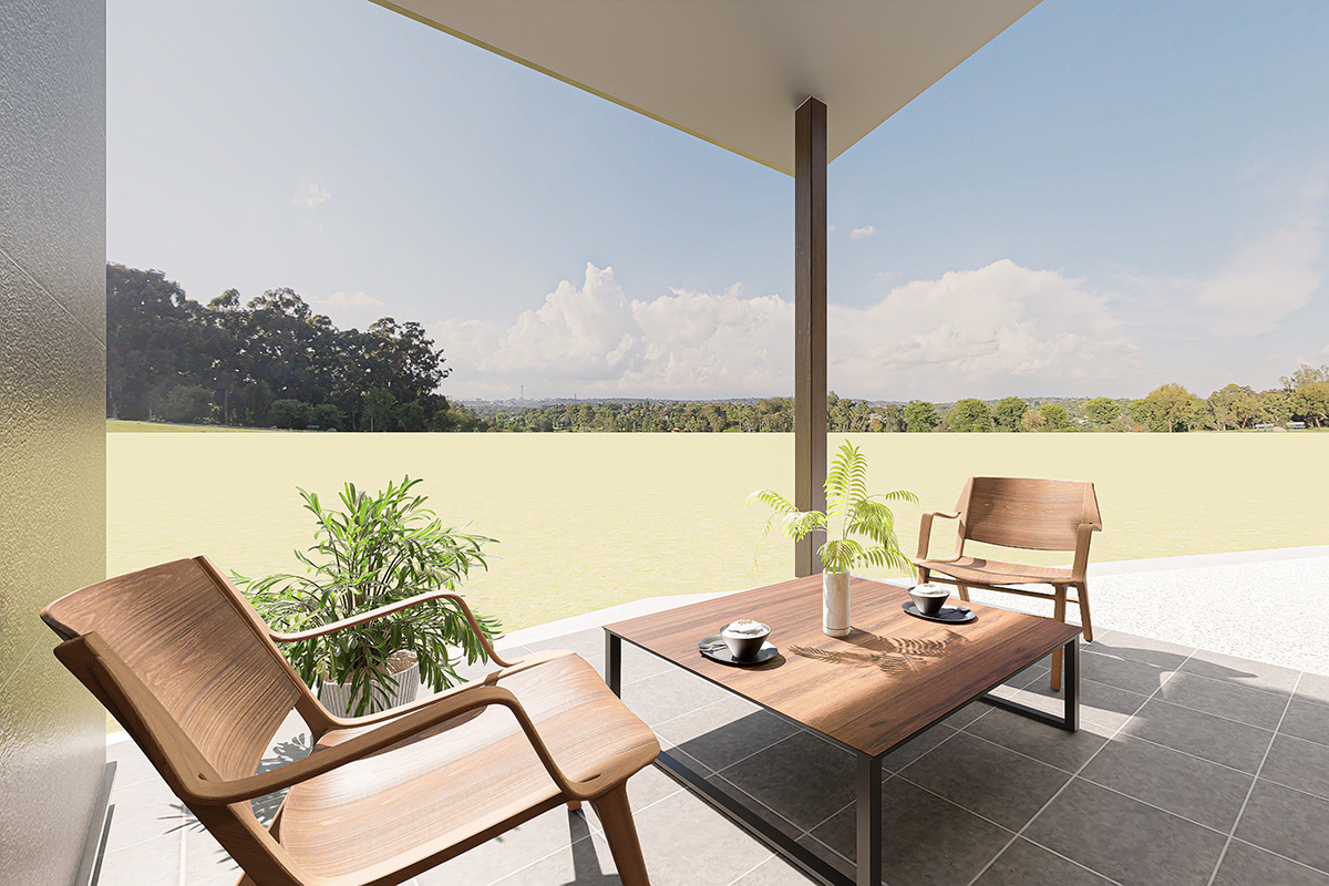 テラスや庭で朝の空気を感じながら過ごす「ソト」。