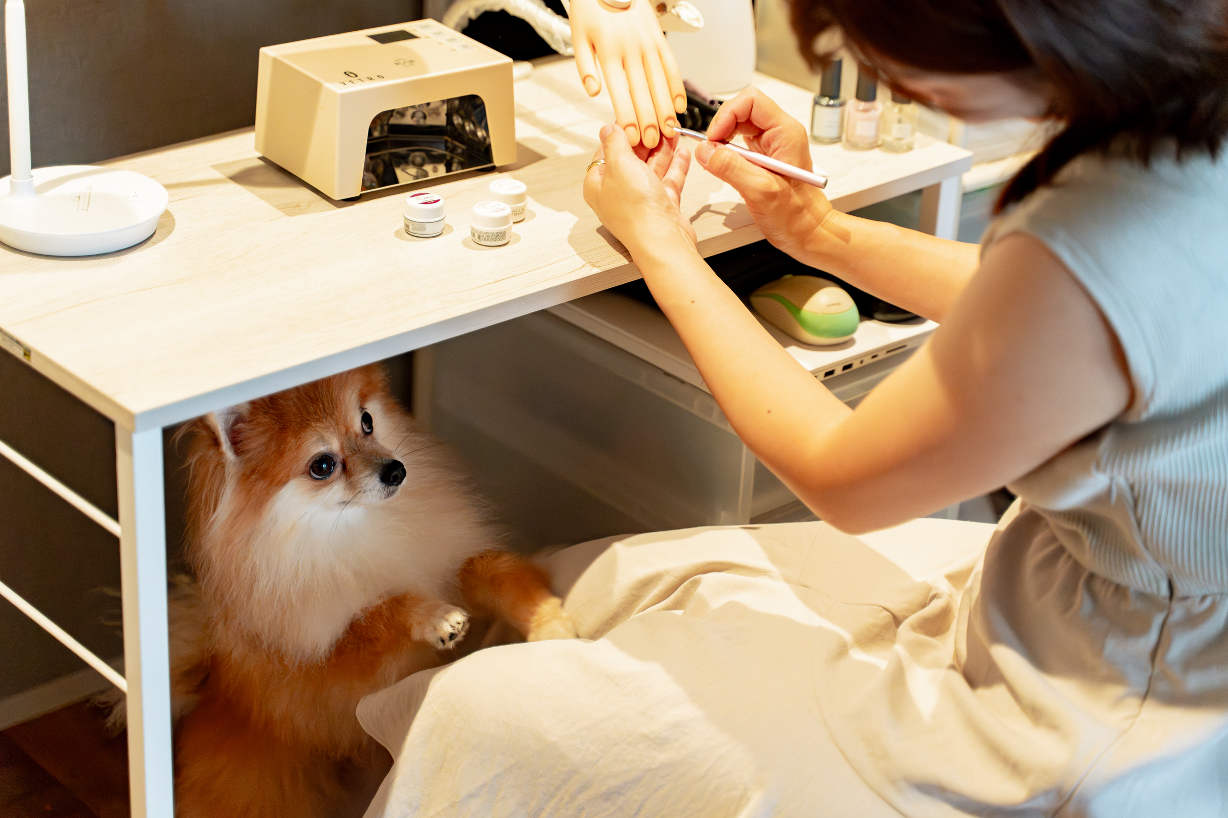 収納スペースとして設計されたリビング脇の空間は、実はネイルアートや在宅ワークを楽しむ趣味スペースにも。ワンちゃんたちがのびのび遊べる広々リビングと、来客時にサッと隠せる収納設計で、生活感を抑えながら“自分らしさ”を楽しめる住まいが完成しました。